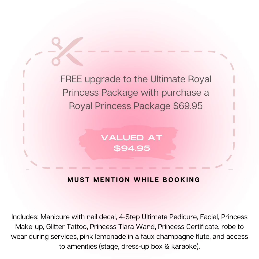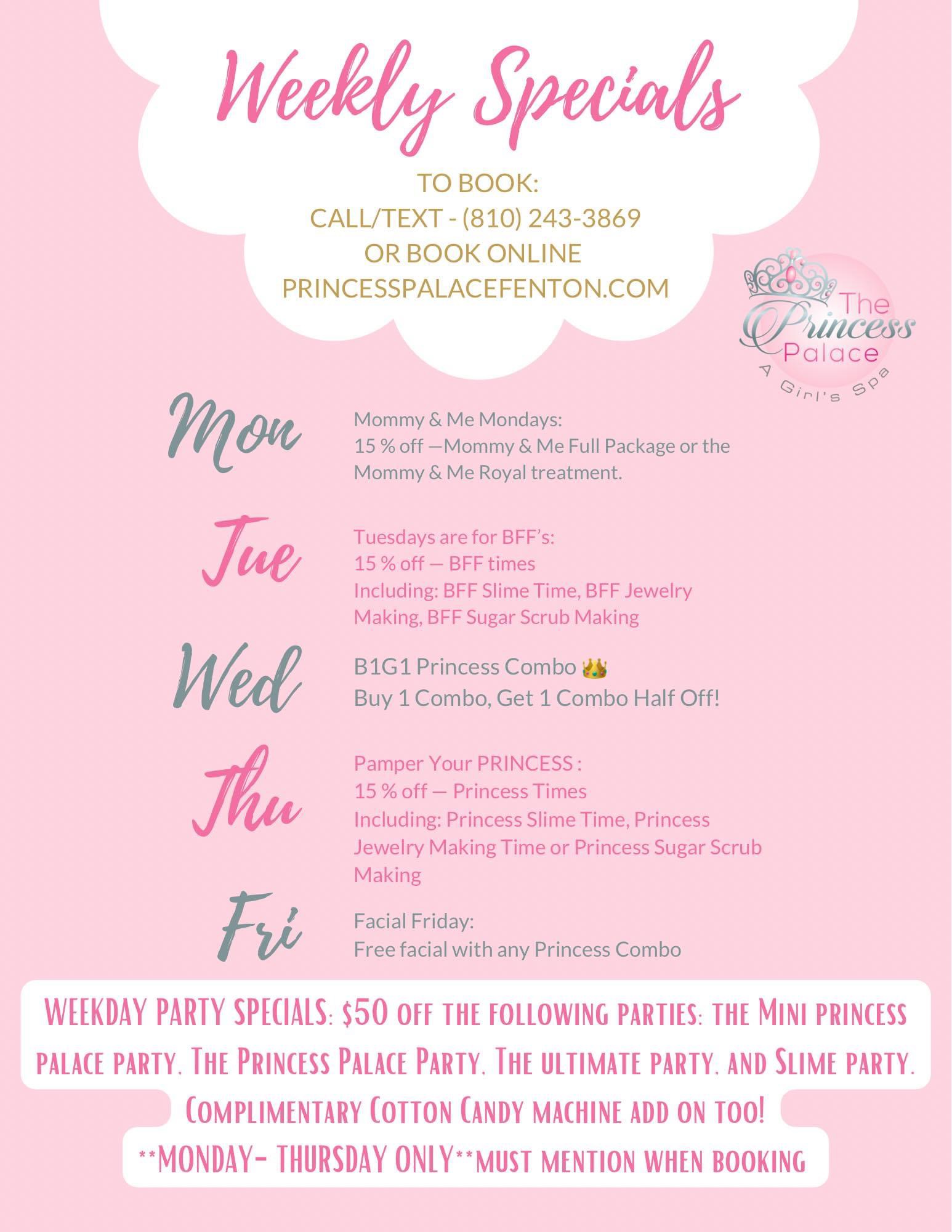 Unlock amazing deals at The Princess Palace Spa! Enjoy weekday party specials with $50 off select parties. Dive into our daily specials for ultimate pampering. See the picture for details and indulge in a royal experience today!
